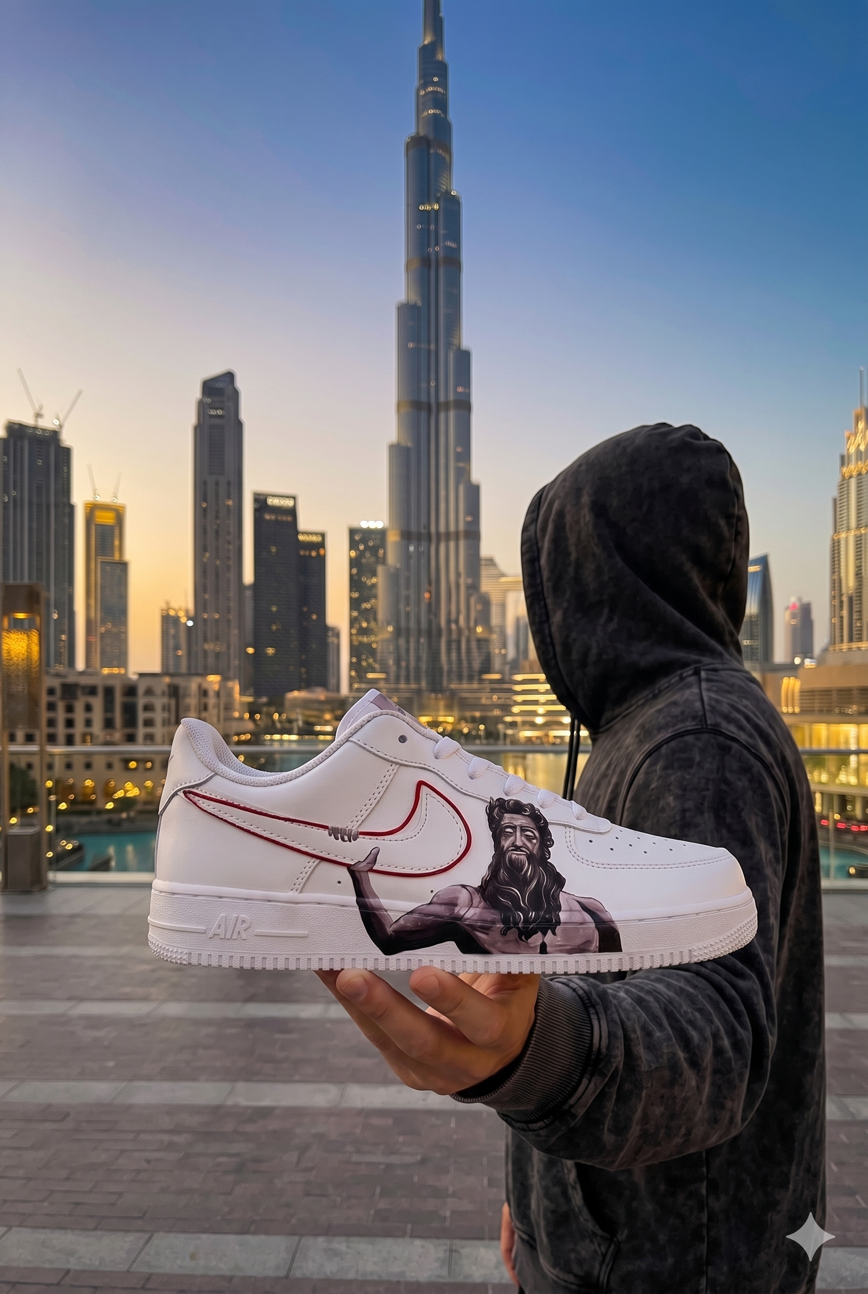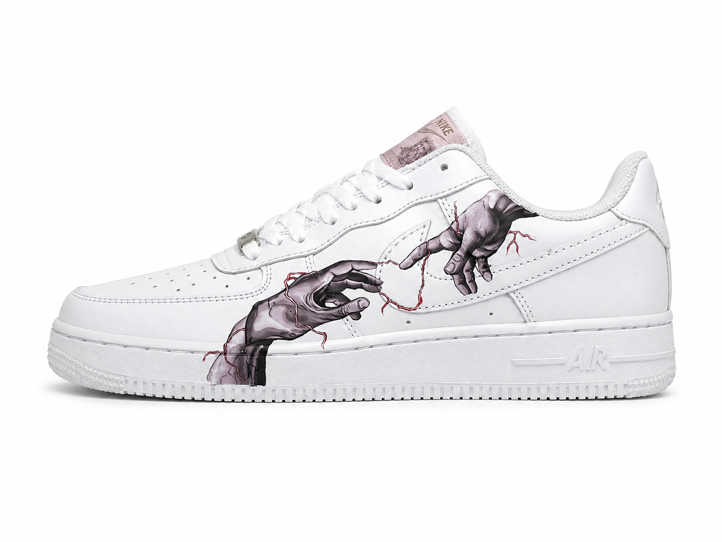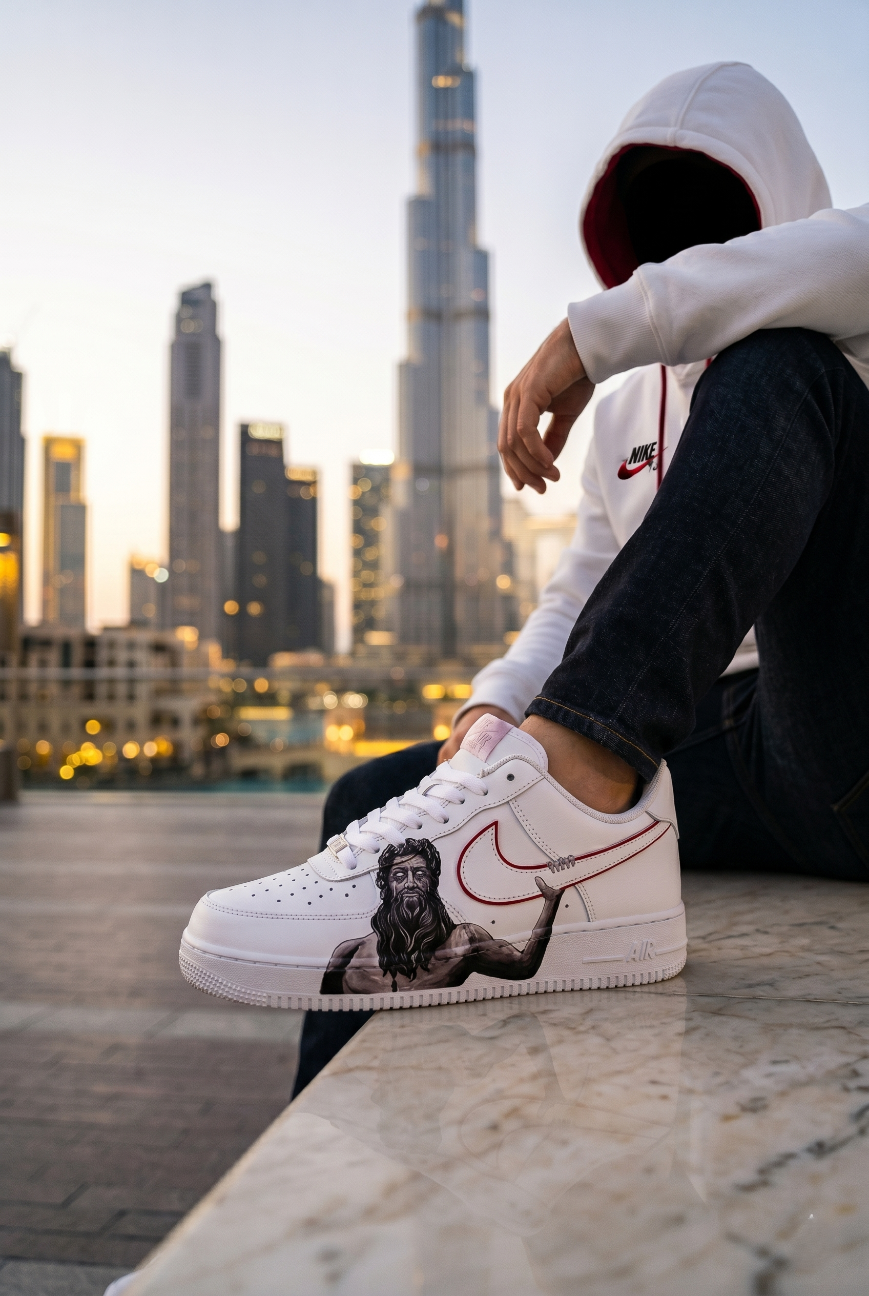 Step into a bold fusion of mythology and art with this custom Nike Air Force 1. Featuring a striking graphic design inspired by Zeus and the iconic “Creation of Adam,” this pair blends classical influence with modern streetwear style. Red accents add a powerful visual touch, making it a true standout piece.
