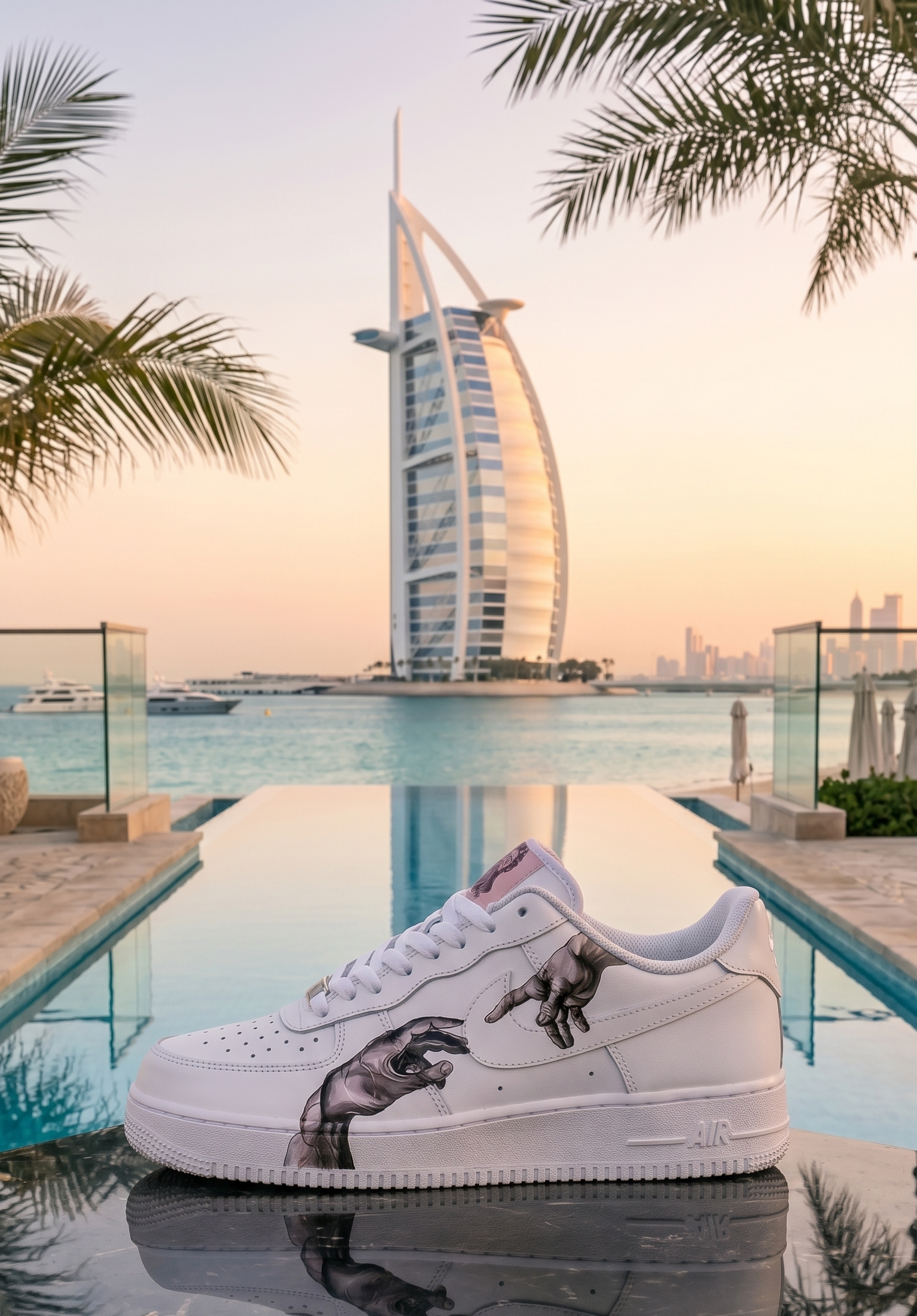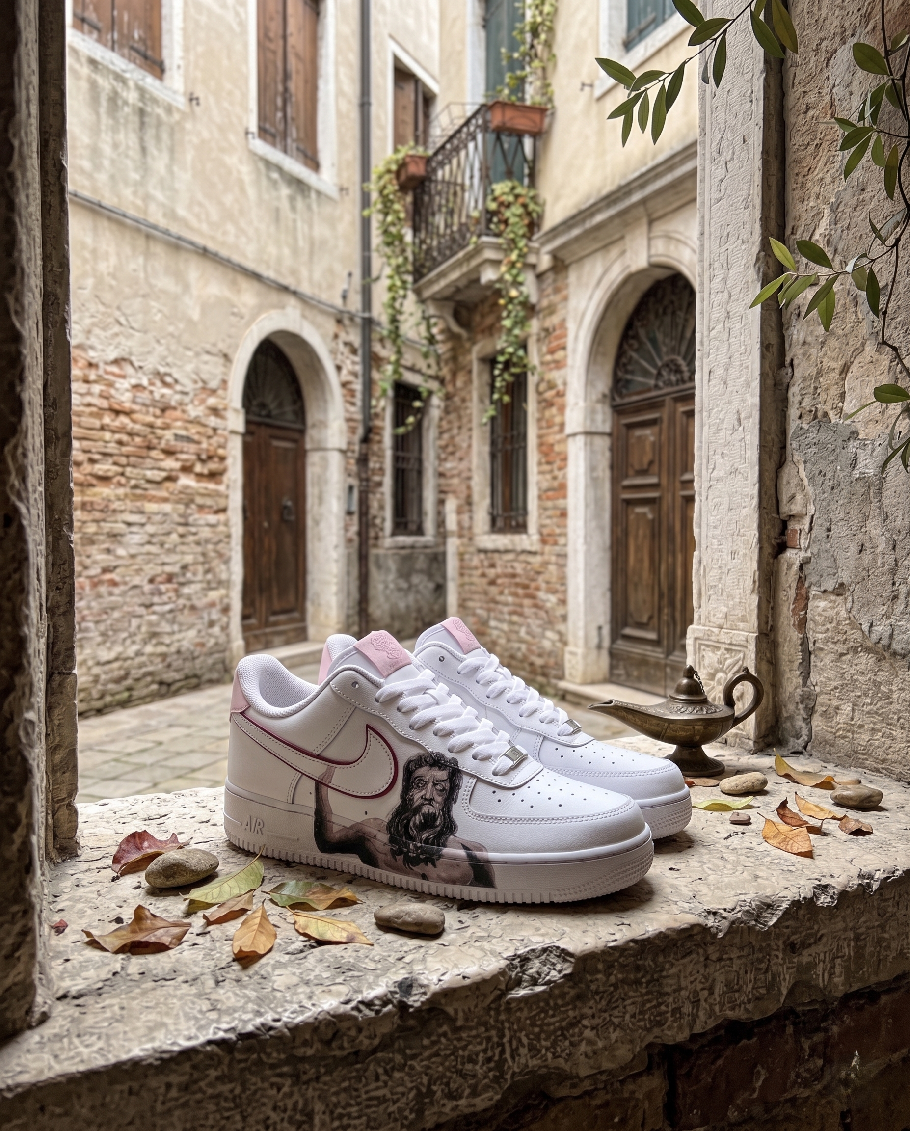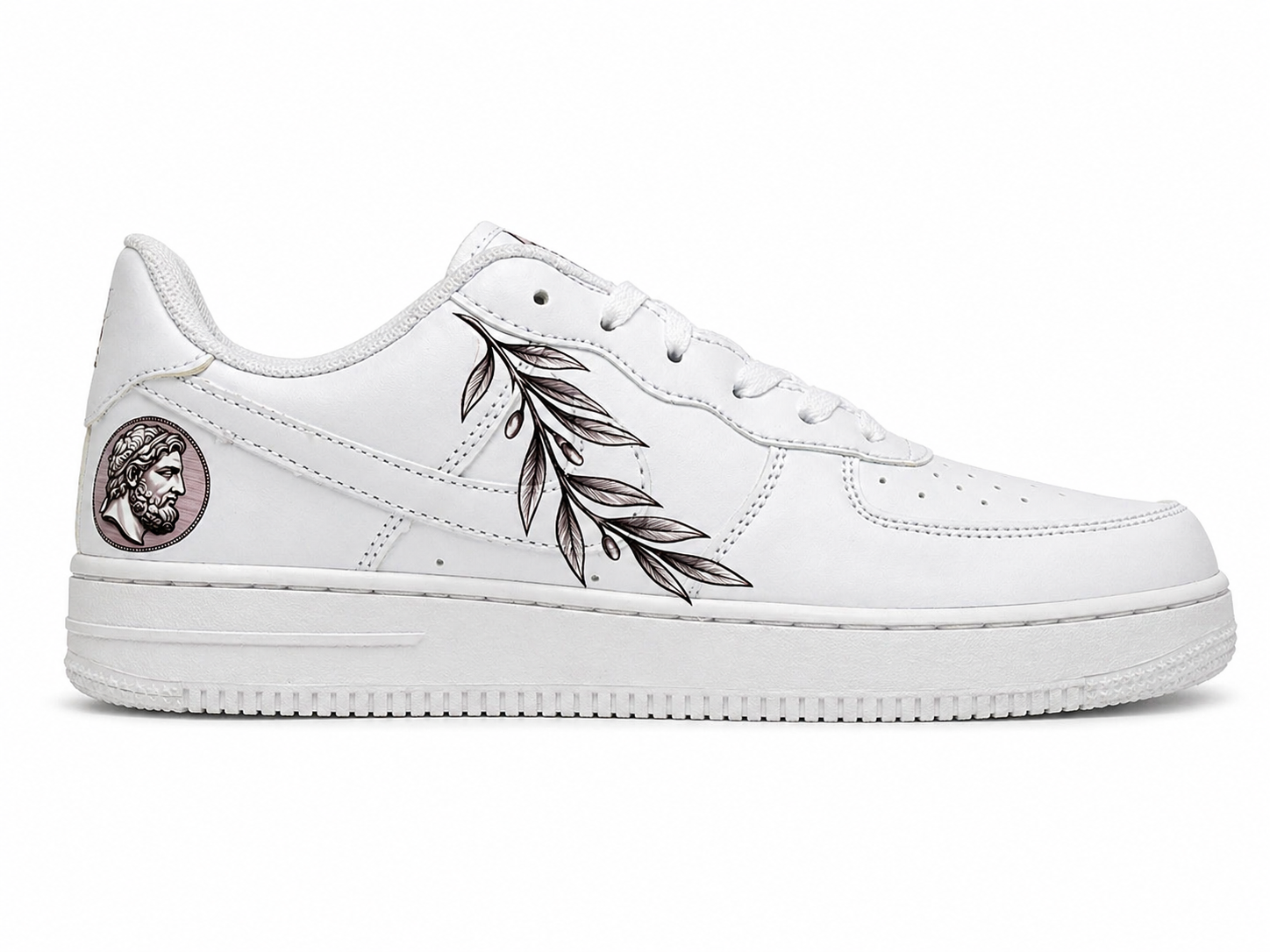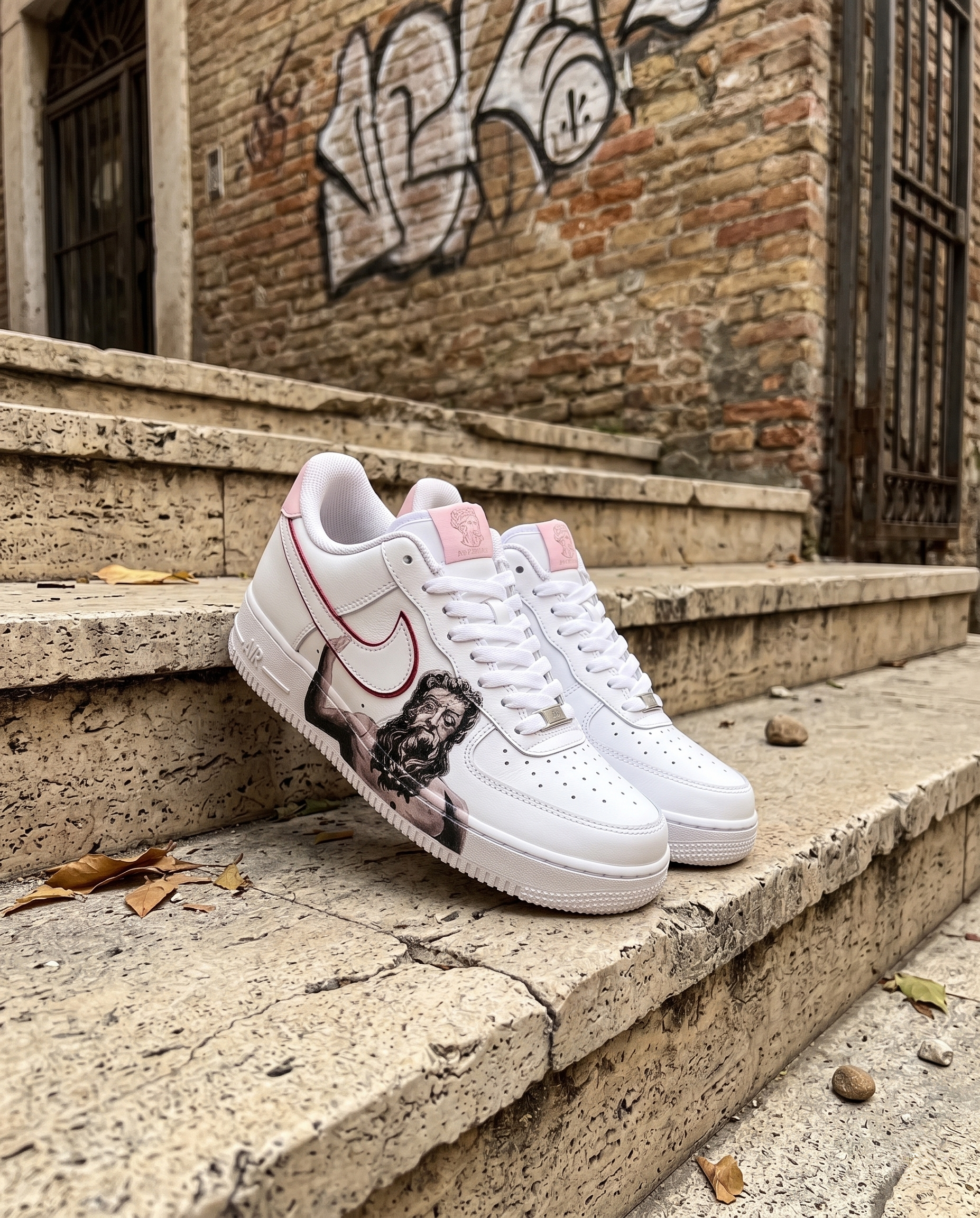 Step into a bold fusion of mythology and art with this custom Nike Air Force 1. Featuring a striking graphic design inspired by Zeus and the iconic “Creation of Adam,” this pair blends classical influence with modern streetwear style. Red accents add a powerful visual touch, making it a true standout piece.